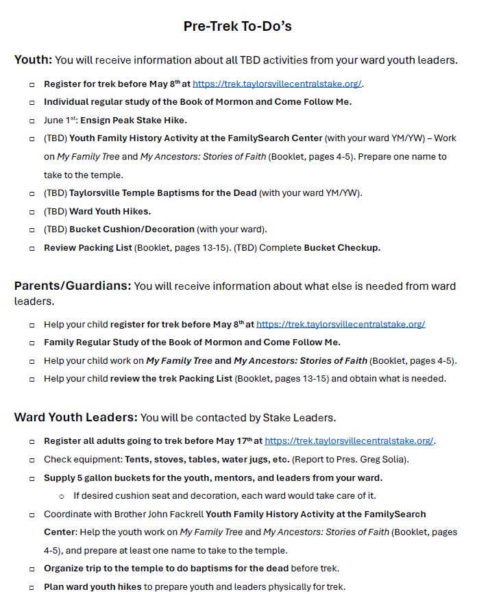 ATTENTION!: Bucket Check-Up will be on Saturday 22nd at the Stake Center. Come with your parents/guardians and your bucket and equipment ready to go. You will bring it back home, and then return with it on Monday 24th at 8 am to prepare to leave for trek by 9:30 am.